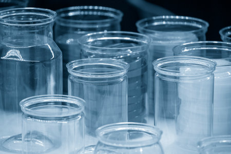 The group of transparent plastic container in the light blue scene. Hi-technology container products manufacturing process concept.