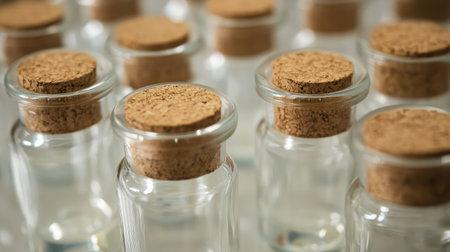 A series of glass vials with natural cork stoppers neatly arranged on a table, showcasing clear liquid inside, perfect for crafting, laboratory applications, or stylish storage solutions.