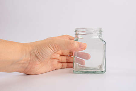 Empty glass transparent jar on a white table. Copy, empty space for text.