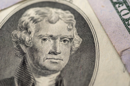 Portrait of former U.S. president Thomas Jefferson as he looks on two dollar bill obverse. Photo at an angle of 15 degrees.