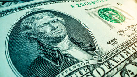 Portrait of the third US President Thomas Jefferson on two dollar banknote bill macro, front side obverse.