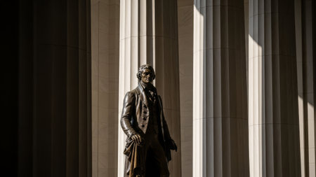 Bronze statue of man in historical clothing, classical columns, New York.