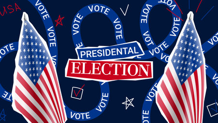 Promo banner for 2024 US presidential election. Vector banner with USA flags and collage items for decoration of USA presidential election. Collage for US Election 2024 campaign. Vote day, November 5.