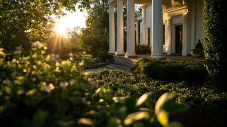 Colonial American Home Glowing in Sunset Light: Professional Photo with Copy Space. Concept Landscape Photography, Golden Hour Light, Historical Architecture, Copy Space, Professional Image