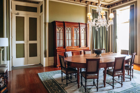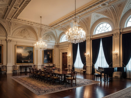 This image showcases a grand dining room with a long wooden table surrounded by chairs, a grand piano, and large paintings on the walls, all set against a white background.