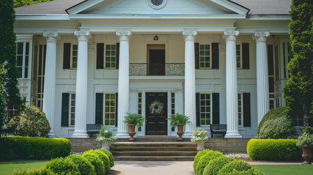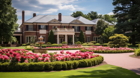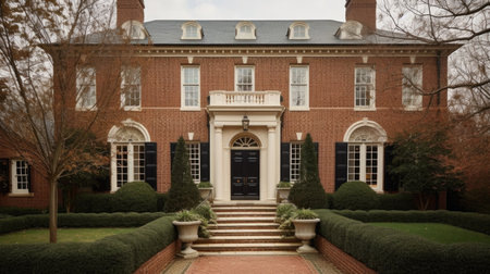 Home architecture design in Colonial Style with Symmetrical design constructed by Brick and wood material. Symmetrical design with classic elements. Generative AI AIG25 .