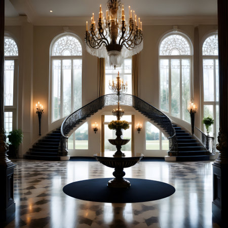 This image showcases the interior of a grand and opulent mansion,featuring a stunning hallway with intricate architectural details,including a magnificent staircase,ornate wood paneling,and a