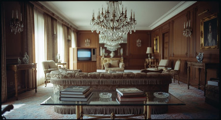 Elegant living room with grand chandelier and large windows in classic design. That the image is generated using AI.