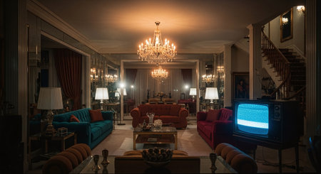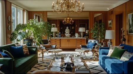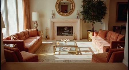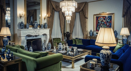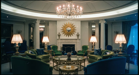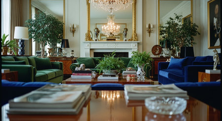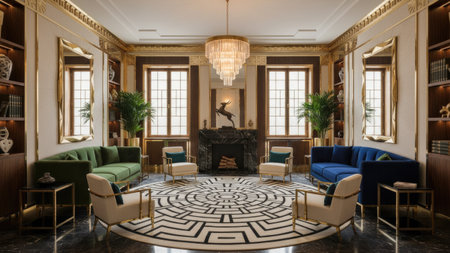 An opulent living room features luxurious sofas and chairs arranged around a central rug. The interior showcases a decorative fireplace, mirrors, and ornate molding, complemented by a large chandelier. The composition suggests a formal setting with natural light, suitable for high-end residential, hospitality, or editorial projects.