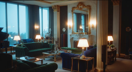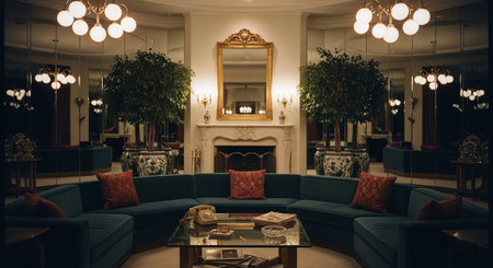 Luxury hotel lobby interior with furniture and lighting. Vintage style.