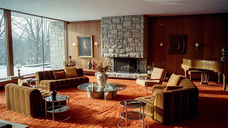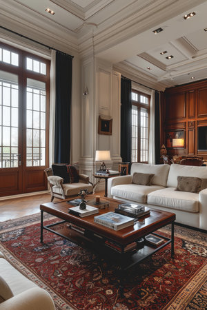 A beautifully designed living room featuring classic furnishings and large windows, creating a warm and inviting atmosphere filled with natural light.