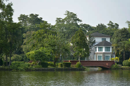 QUEZON CITY, PH - OCT 6 - Ninoy Aquino parks and wildlife water lagoon plus house facade on October 6, 2018 in Quezon City, Philippines.