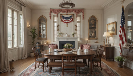 Gathering space shows table and chairs with patriotic decorations and sunlight shining through windows