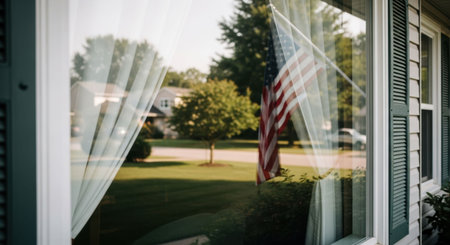 American flag reflected in a house window with white curtains and green shutters. Usa patriotic concept for Fourth of July celebration.