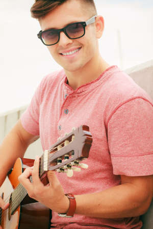Performance and show on fresh air. Young fashionable man wearing sunglasses playing classic guitar outdoor. Summer time.