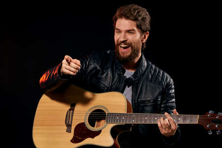 A man with a guitar in his hands leather jacket music performance rock star modern style dark background
