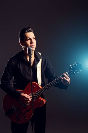 Professional male musician plays and sing in the style of the sixties. Rock'n'roll, jazz man. Beat generation. Nostalgia.