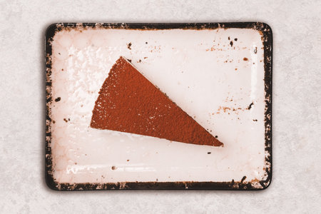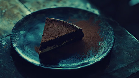 A delectable slice of rich chocolate cake dusted with cocoa powder sits on a rustic plate, illuminated by soft ambient light, creating an inviting food photograph.
