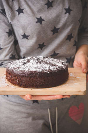 The girl holds in her hands a homemade chocolate cake sprinkled with icing sugar. Cake for a holiday or birthday. Girl in home clothes with the stars.