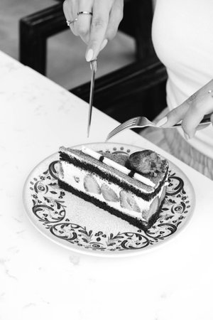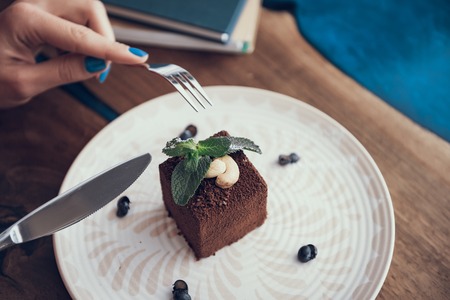 Lady with manicure holding knife and fork while getting ready for cutting delicious chocolate cake with cream berries and pepper mint