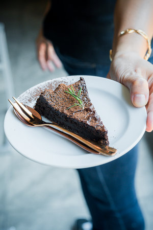 Hand holding plate of slice of chocolate cake with sprig of rosemary and spoon