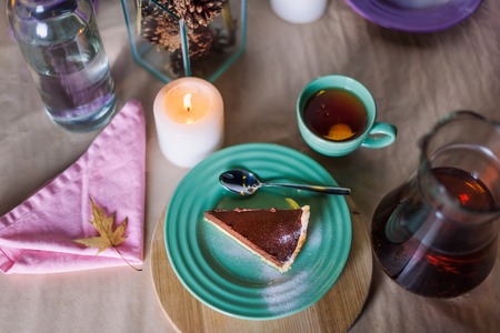 Piece of delicious chocolate mousse cake on colorful plate on wooden table background. Table setting for tea party. Selective focus