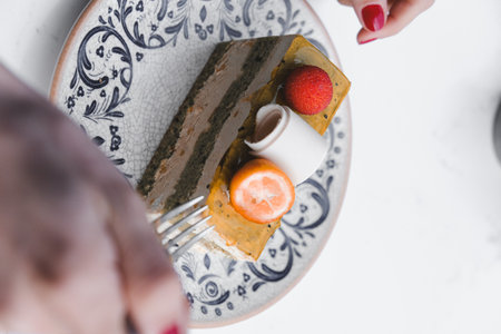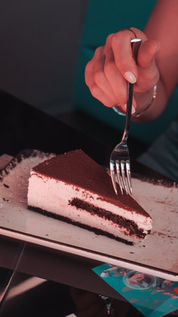 Closeup of woman eating tasty chocolate cake with berries while meeting with friend at cafe