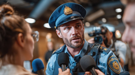 Professional police officer in uniform looking confidently, participating in an official meeting or discussion within a government building