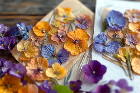 Vibrant pressed flowers in orange, purple, and blue shades arranged on paper sheets. Wooden background, artistic nature concept.