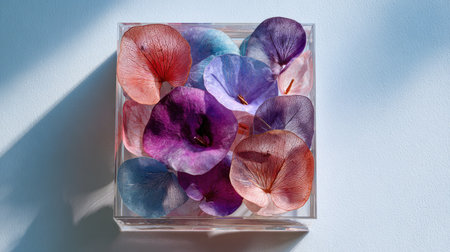 An overhead view reveals a square transparent container filled with vibrant flowers. The composition showcases a spectrum of colors including purple, red, and blue. The scene is illuminated by soft lighting, casting gentle shadows. This image could be used for various commercial projects related to nature or beauty.