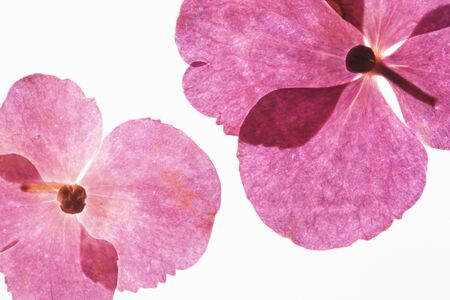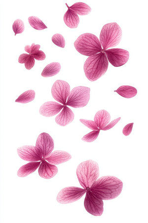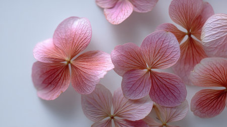 Beautiful arrangement of hydrangea petals in soft pink tones, highlighting delicate textures and intricate details on a serene white background, perfect for artistic projects.