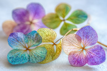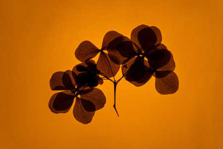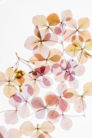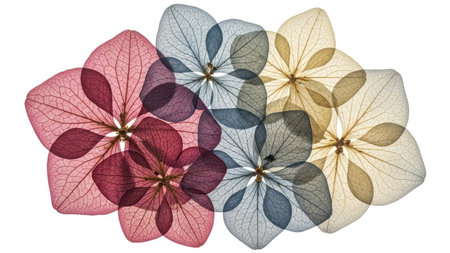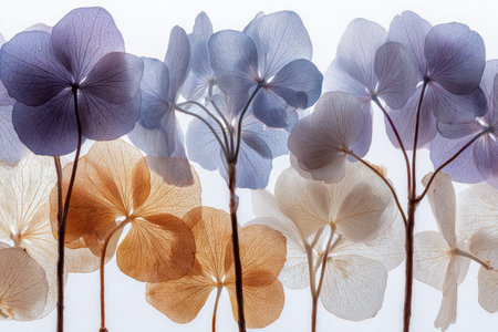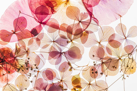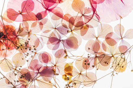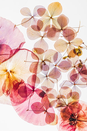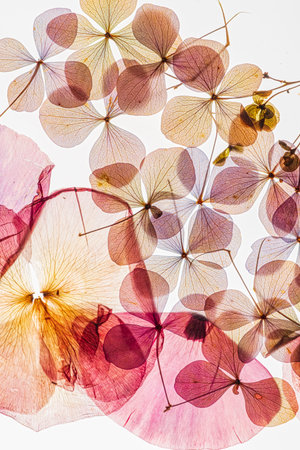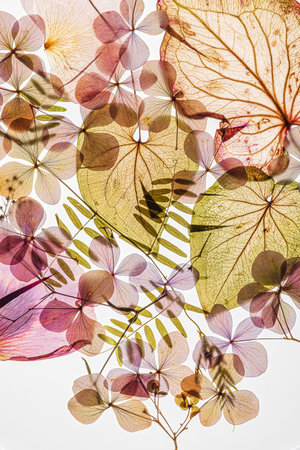 Translucent flowers and leaves are artistically arranged to highlight their intricate patterns.