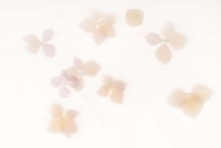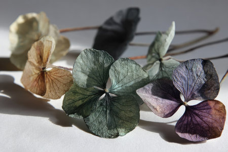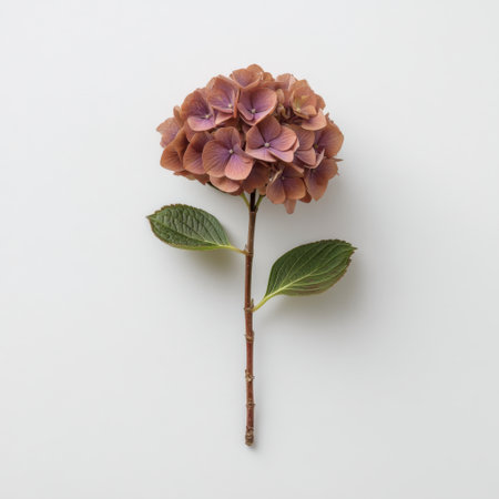 dried hydrangea cluster on white feathered falloff soft ring shadow minimal calm composition