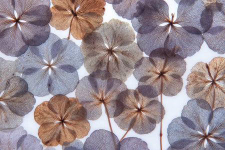 A mesmerizing display of dried flowers and leaves lays elegantly arranged on a bright surface, capturing the intricate patterns and hues of nature as sunlight filters through the petals.