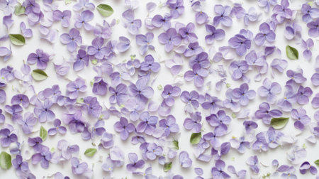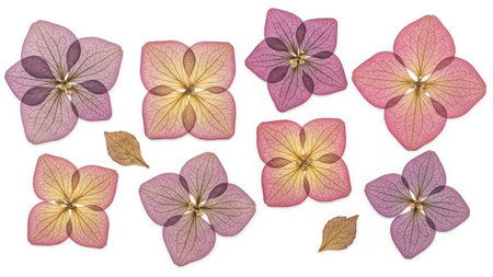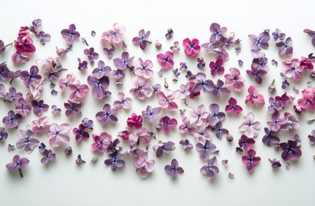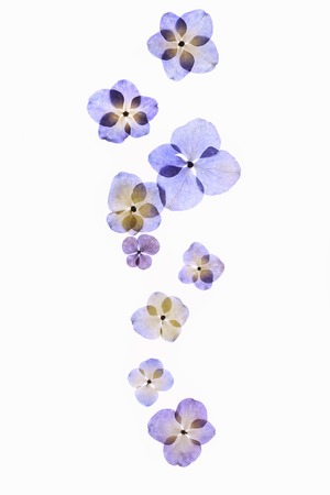 A collection of small purple and pink hydrangea flowers scattered on a white background