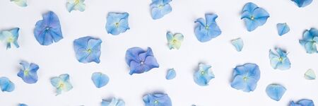 Flowers composition. Floral pattern of blue flowers hydrangea on white background. Creative floral texture. Flowers pattern flat lay. Top view