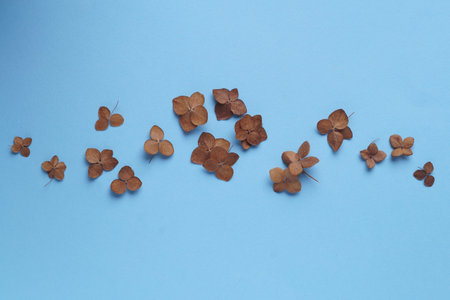 Flat lay composition with dried hortensia flowers on light blue background