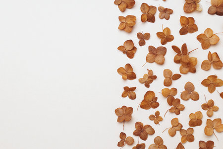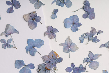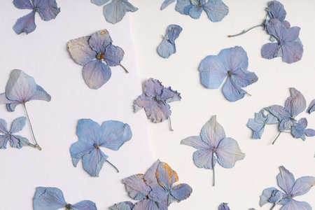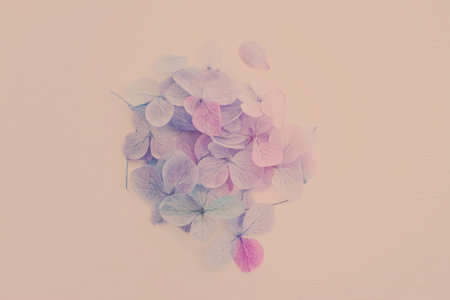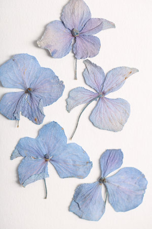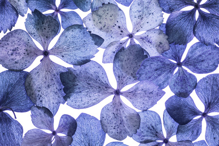 Dry petals of hydrangea lying on the grey papper background. Vintage filter.
