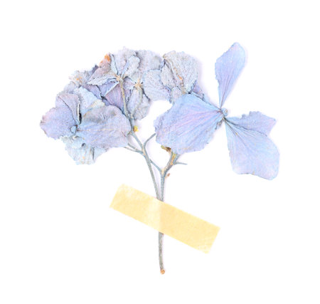Beautiful dry hydrangea flowers with adhesive tape isolated on white, top view
