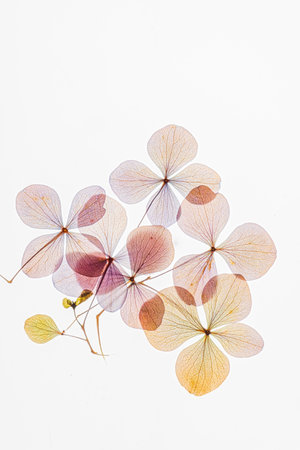 Dried Hydrangea flowers cluster, displaying subtle pink and yellow hues on a stark white canvas.