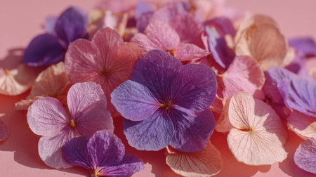 A colorful spread of pink and purple flower petals lays scattered on a soft pastel surface, illuminated by gentle afternoon light. Their delicate textures and shades create a serene atmosphere.