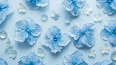 Delicate blue hydrangea blossoms with dew on a soft pastel background. Concept of blue Monday