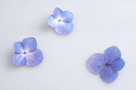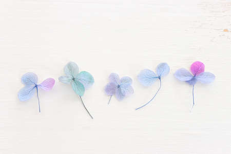 Top view image of Hydrangea flowers composition over white wooden background .Flat lay