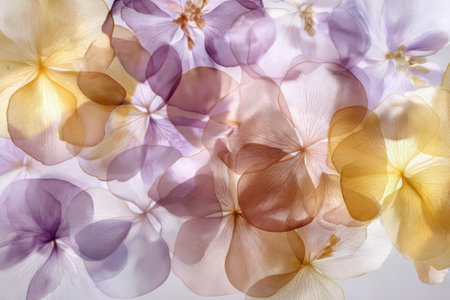 A collection of translucent flower petals in shades of purple, yellow, and cream forms a gentle and inviting display. The soft colors blend harmoniously together.