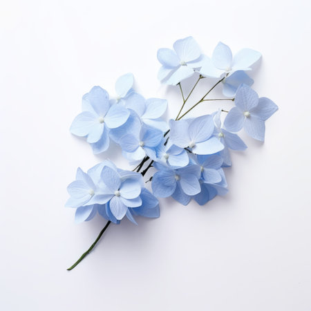 close up of a free hydrangea flower on a watery white background. the image captures the delicate paper cutout style, with light blue hues resembling akihiko yoshida's artwork. the minimalistic object, created by franois boquet, showcases a simple and elegant composition made entirely of flowers. ai generated