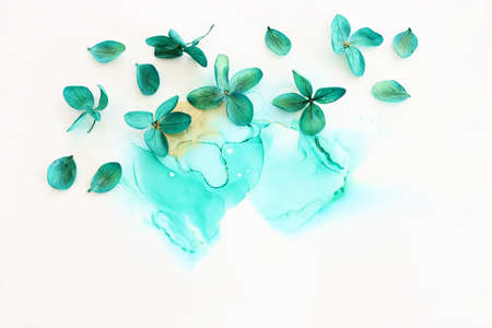 Creative image of emerald and green Hydrangea flowers on artistic ink background. Top view with copy space