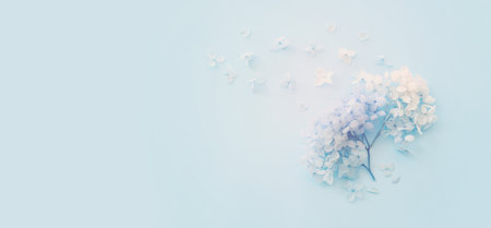 Top view image of blue Hydrangea flowers over pastel background .Flat lay
