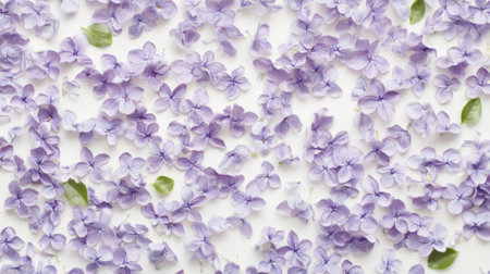 Purple lilac flowers and green leaves scattered against white background, AI generated
