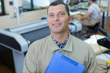 I always have the final say. Portrait of a man checking the quality of a print run in a factory.