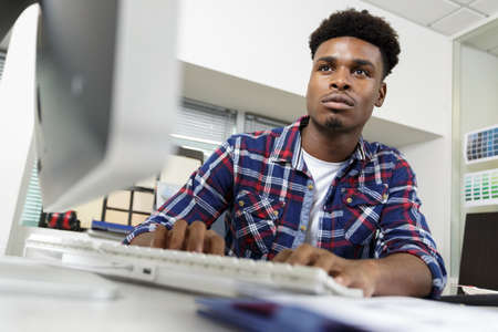 Portrait of serious middle-aged African American man in uniform checking printed samples of notebooks in printer shop